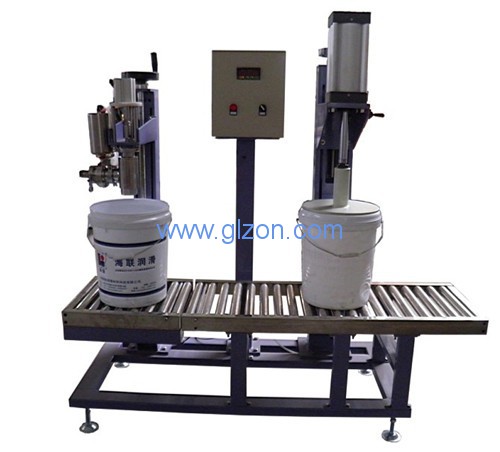 操作時,操作者僅需簡單設定好灌裝重量,按下 [啟動]按鈕,再將擺放到空桶輸送機上。 灌裝機就會自動將空桶輸送到位并推入磅臺,然后自動將灌裝頭插入桶內,并將空桶自動去皮后打開灌裝閥門,精確地雙速灌裝;灌裝結束,灌裝頭自動提升至桶外,輸送機自動將灌裝完成的包裝桶送出,人工旋蓋并擺放到托盤即告完成。