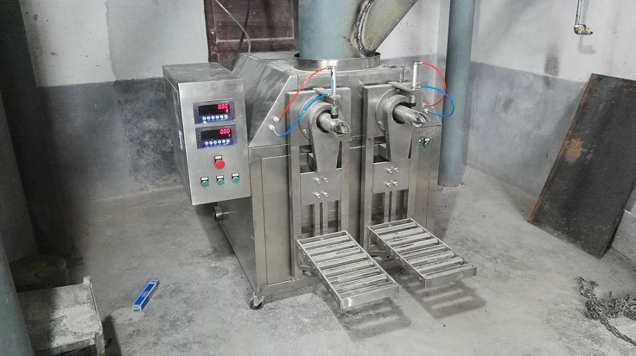 將閥口包裝袋套在加料嘴上,按動“允加”按鈕,這時壓袋氣缸開始工作并壓住袋口,控制器將包裝袋重量自動去除,破拱電機緩慢轉動,保證下料暢通。加料螺旋高速轉動迅速將物料灌入袋中,隨袋中空氣一起溢出的粉塵通過吸塵器由除塵器吸走,振動裝置同時啟動將托盤上袋中物料振實充滿袋角。待加料快到設定值時,加料螺旋進行減速慢加,到設定值時,加料停止。誤差<0.3%。這時壓袋氣缸松開袋口,翻袋氣缸將托盤翻轉,將物料翻倒在皮帶輸送機上及時送出。