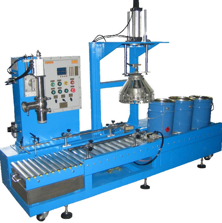 人工將空桶放到秤臺上,,然后點擊啟動按鈕,儀表首先判桶并扣除空桶皮重,灌裝頭下降并插入桶內并打開進入快速落料,當達到慢進料設定重量時,自動轉為慢速落料。當重量達到目標值時停止落料,此時灌裝頭復位到初始狀態,儀表回皮顯示總重,人工將成品桶移出并人工放蓋推到壓蓋區,腳踏開關啟動,壓蓋氣缸伸出并壓蓋,壓蓋完成人工取下桶,整個動作流程結束。