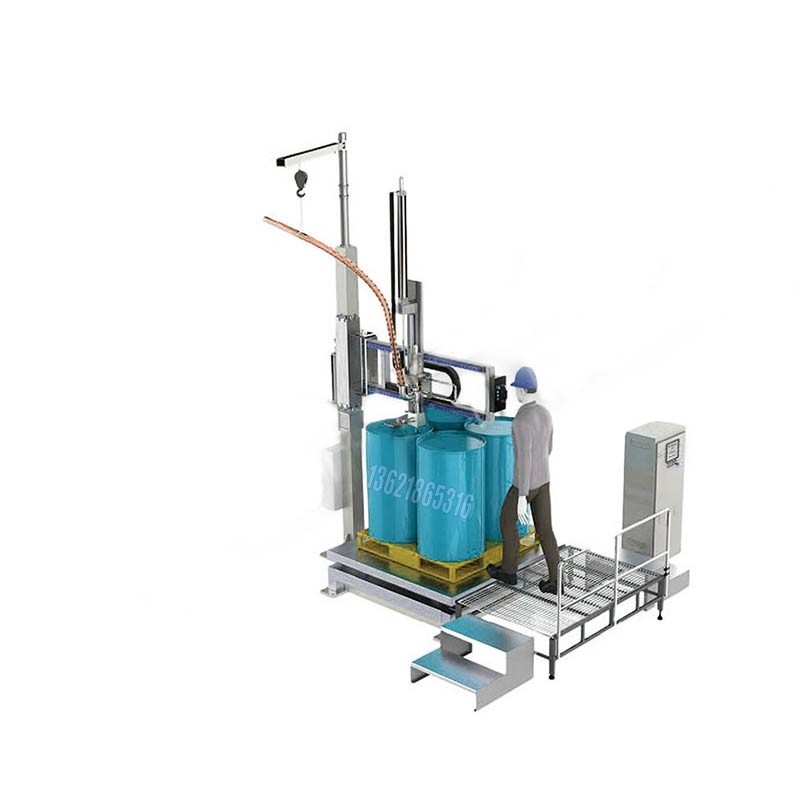 工作流程:人工對桶→按【啟動】鍵→槍頭自動插入桶內→自動去皮重→自動雙速度灌裝→完成自動提搶→防滴盤接液→誤差檢測顯示→人工下桶旋蓋;