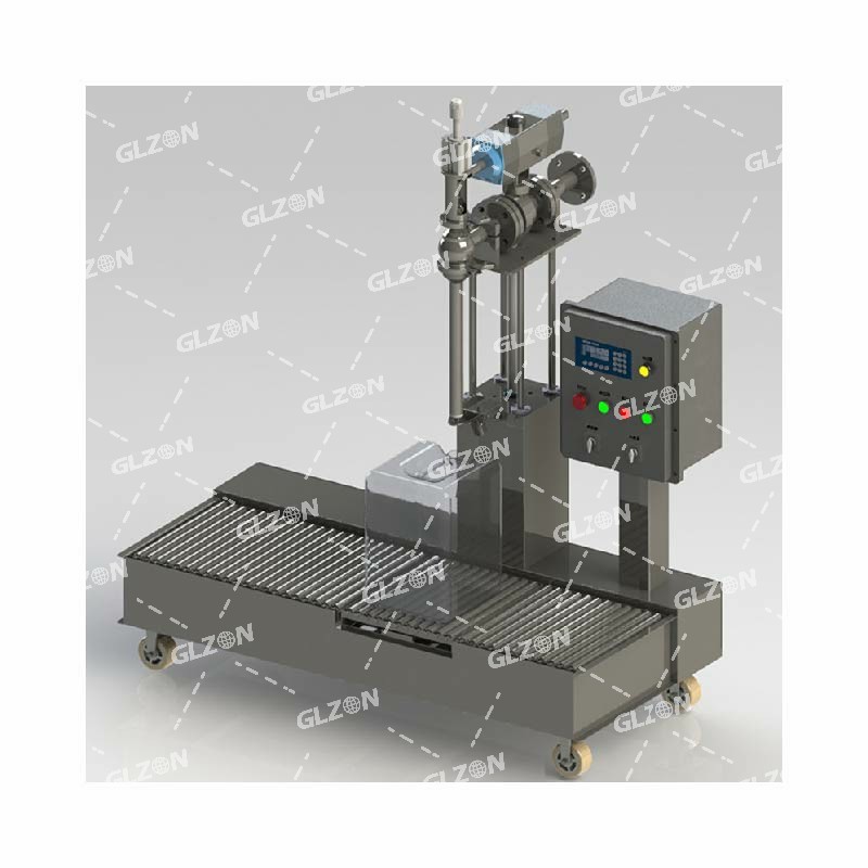 ■ 在灌裝系統的控制下,灌裝自動定位找到桶口,灌裝頭自動插入桶口,并將空桶自動去皮,系統打開球閥,進行大中小料三段式灌裝;