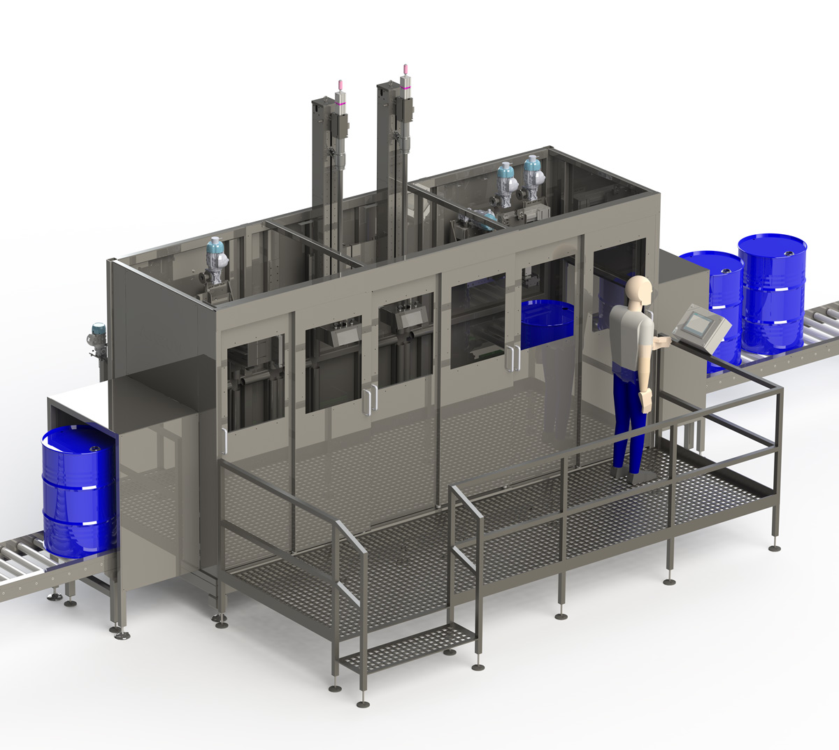 The automatic drum filling system is indicated for filling liquid and viscous products in metallic and plastic 120 to 250 liters drums. It is completely automatically and safely for the operator and it has an integrated automatic conveyor line. Different workstations can be added to the equipment.