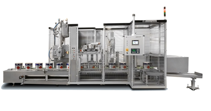 Automatic Varnishes Can Filling Machine model is equipped with 1 dosing head whilst Automatic Varnishes Can Filling Machine incorporates two identical dosing heads.