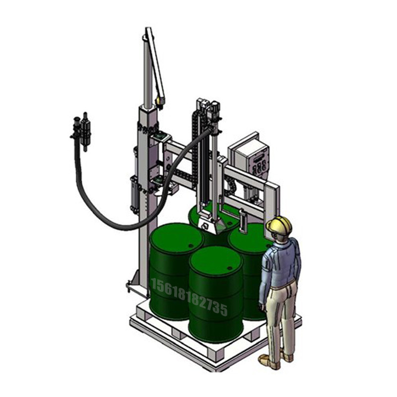 操作流程:開機--叉車放桶至秤臺---操作灌槍手柄,按剎車解除鈕并左右、前后快速對口--釋放剎車解除鈕,灌槍緊緊固定--按【開始】鍵--灌槍自動插入桶口--自動去皮--自動打開灌槍及球閥組---大、小、微量三段灌裝---灌槍自動隨液面自動提升---到達目標值---灌槍自動關閉并升至桶外--(移除灌槍至下一桶,重復以上步驟至50L四桶灌裝結束)---灌裝完成。<br><br>