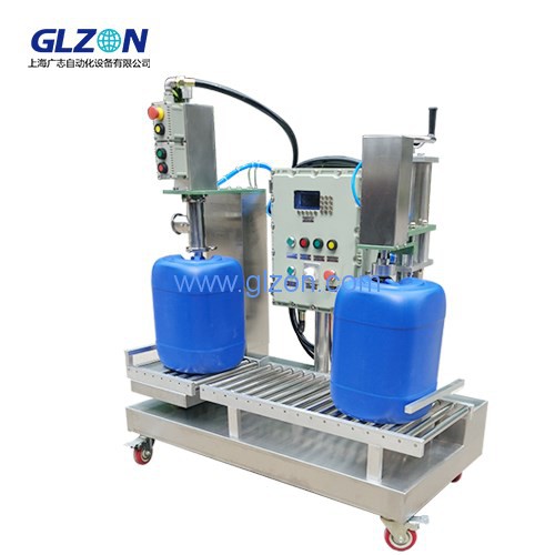 塑料方桶自動灌裝機 自動旋蓋 18/25升設備特點●獨特防滴漏裝置,避免物料滴于桶上●灌裝管在桶口內灌裝,避免產品飛濺●高可靠性設計,工作性能穩定●根據需要提供防爆型產品●根據需要附加保溫/伴熱裝置●灌裝頭撞桶自動保護功能適用產品●5升到20升各種鋼制或者塑義ian萜?/p>●涂料,油墨,溶劑,潤滑油,粘合劑●不容易起泡的液體產品●其他液體化工產品技術參數型號:GZMS-20-2閥門材料:SUS304/PTFE灌裝精度:士0.1%~ 0.2%灌裝方式:2檔控制(可選三檔)灌裝速度:120~240桶/小時控制方式:電動 氣動防爆等級:ExdⅡBT4計量方式稱重計量電源:AC 380V/220V ,50Hz氣源:4-7kg/cm2,100升/分 上海廣志自動化設備是專業生產25升灌裝機的廠家,歡迎廣大客戶前來咨詢,電話021-60518382 上海廣志自動化設備是專業生產25升灌裝機的廠家,歡迎廣大客戶前來咨詢,電話021-60518382 上海廣志自動化設備是專業生產25升灌裝機的廠家,歡迎廣大客戶前來咨詢,電話021-60518382