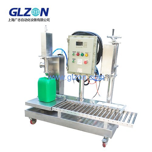 25升方桶灌裝機 自動旋蓋灌裝機功能 ●結構簡單,便于使用和維護●料罐和閥門便于清洗,適用于經常更換產品的場合●灌裝速度可任意調節,灌裝精度高●料罐上部可以附加過濾裝置適用產品●5升到20升的各種罐型的容器●涂料,油墨,溶劑,潤滑油,防凍液●其他液體化工產品技術參數型號:GZMS-20閥門材料:SUS-304灌裝精度: 士0.1%~士0.2%灌裝方式:2檔控制(可選三檔)灌裝速度:2~6罐/分鐘(單頭)灌裝頭:1~4個防爆等級:ExdⅡBT4計量方式稱重式電源:AC220V/50Hz氣源:4-7kg/cm2 ,70升/分上海廣志自動化設備是專業生產25升灌裝機的廠家,歡迎廣大客戶前來咨詢,電話021-60518382 上海廣志自動化設備是專業生產25升灌裝機的廠家,歡迎廣大客戶前來咨詢,電話021-60518382 上海廣志自動化設備是專業生產25升灌裝機的廠家,歡迎廣大客戶前來咨詢,電話021-60518382