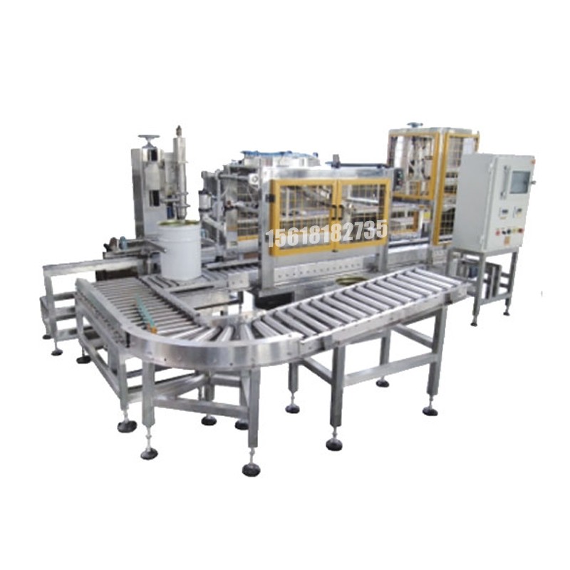自動上桶分桶→自動對孔→自動灌裝→自動放蓋壓蓋→自動貼標→人工碼垛→自動纏繞膜