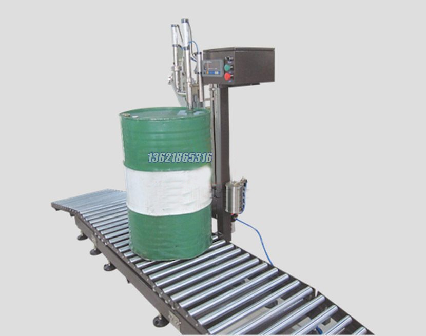 應用案例YCS-200型高灌稱重式灌裝機,原理是由稱重傳感器平臺在微電腦程序的控制下設定計量是高精度,高技術產品,是集機、電、儀一體化的新型機種,它改變了傳統流量計式灌裝機定量精度及無法對較粘液體的計量缺陷,是文明生產和國家明令規定淘汰杠桿秤后,融稱重與灌裝一體化的理想設備。灌裝時先去除皮重,操作者只需要將容器放入平臺,桶口對準灌裝咀,此時程序啟動,打開灌裝閥進料, 物料在注入容器時先大量快速灌裝后再慢速小劑量修正計量,當達到設定量是自動停止灌裝,灌裝咀上升,完成灌裝過程。稱重灌裝機適用于各種有粘、無粘、有一定腐蝕性和無腐蝕性、無泡沫的液體稱重定量灌裝。功能特點1.灌裝方式:液面上灌裝(頂部灌裝)。2.控制方式:灌裝方式由人工設定,微動開關控制。3.輸送方式:輥道無動力輸送帶。4.具備數字式顯示灌裝量的功能,可完成多種灌裝量的設置。5.具備自動去皮,按凈重灌裝的功能。6.具備真空回抽防滴漏的功能。7.具備控制系統手動和自動(微動開關控制)功能。8.具備快慢雙速控制功能,防止飛濺。9.具備防止誤操作和斷電保護等緊急處理功能10.液體流經管道為不銹鋼304材質11.密封件采用硅橡膠(耐磨損、耐高溫、耐酸堿、耐腐蝕),氟橡膠(耐磨損、耐強酸堿、強腐蝕).【根據實際物料屬性溫度匹配合適的密封件】型號YCS/200L(單頭)YCS-D/200L(雙頭)灌裝范圍20-250kg(300kg可選)20-250kg(300kg 可選)灌裝速度30-50桶/小時80-120桶/小時灌裝精度±0.1%(200KG作為參考值)進料壓力0.3~0.35MPa工作壓力0.4~0.6MPa耗氣量0.2m3/分鐘電源AC220V 50HZ稱重部分機器尺寸(mm)1200x870x1650(mm)1500x870x1650 (mm)重量Weight120 kg200 kg上海廣志自動化設備是專業生產200升灌裝機的廠家,歡迎廣大客戶前來咨詢,電話021-60518382 上海廣志自動化設備是專業生產200升灌裝機的廠家,歡迎廣大客戶前來咨詢,電話021-60518382 上海廣志自動化設備是專業生產200升灌裝機的廠家,歡迎廣大客戶前來咨詢,電話021-60518382