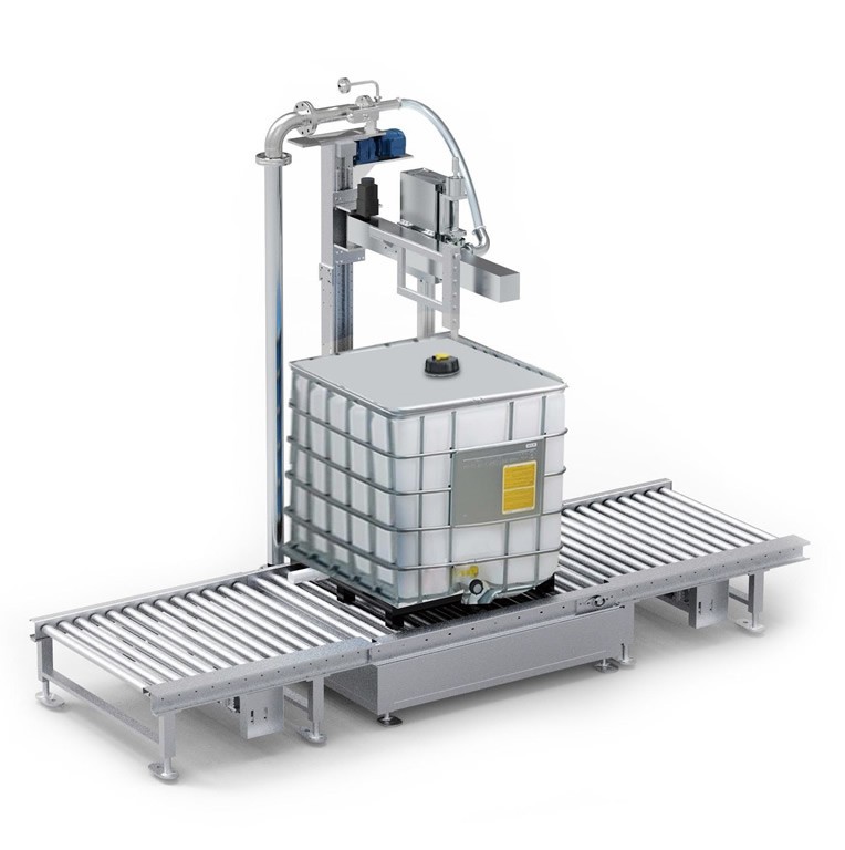 人工將空桶放到空桶暫存區,自動輸送到秤臺上,,然后點擊啟動按鈕,儀表首先判桶并扣除空桶皮重,灌裝頭插入桶內打開進入快速落料,當達到慢進料設定重量時,自動轉為慢速落料。當重量達到目標值時停止落料,此時灌裝頭復位到初始位置,儀表回皮顯示總重,自動輸送到成品暫存區,待叉車取走,整個動作流程結束。