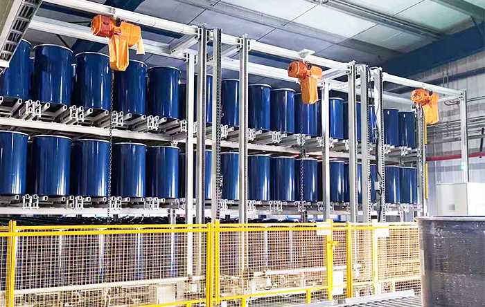 Robotic drum warehouse stores 1000+ 200L drums with Ex-proof systems. Fire suppression, leak containment & SAP integration. NFPA 30/SEVESO III compliant.